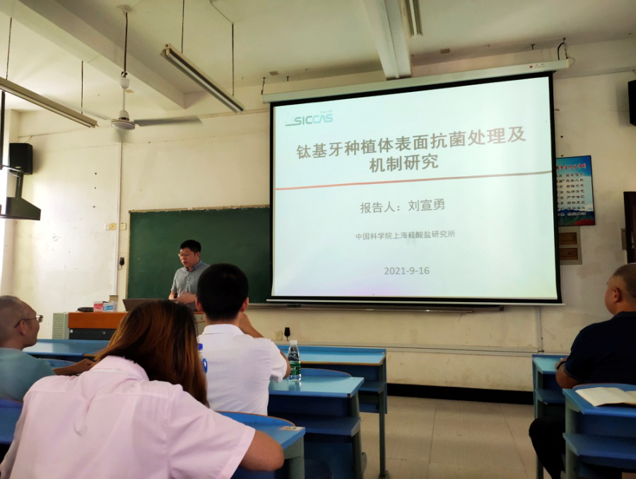 2021年9月16日上午,中国科学院上海硅酸盐研究所研究员刘宣勇应邀来我所讲学,在9栋教学楼206室做了题为《钛基牙种植体表面抗菌处理及机制研究》的精彩学术报告,我所与化学化工学院师生代表共计80余人参加了报告会。