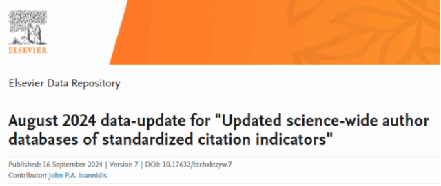 近日,爱思唯尔(Elsevier)与美国斯坦福大学(Stanford University)更新了标准引文指标的全科学作者数据库,并发布了第七版《全球前2%顶尖科学家榜单2024》(World’s Top 2% Scientists 2024)。